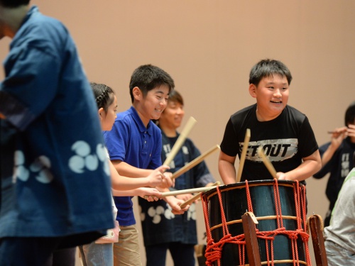 今回の公演では,1年生から6年生までそれぞれ3名ずつ,18名が登壇し,和太鼓の演奏を体験するコーナーがありました。舞台にたって体験した友だちに客席から声援をおくるなどして,充実した楽しい時間を過ごしました。