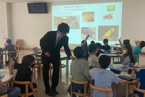 山梨学院短期大学の萱嶋泰成教授を招き,「動物の色と模様について」というテーマでお話をうかがいました。様々な生き物の写真や動画を見ながら,先生の問いかけに,多くの子どもたちが自分の考えを発表していました。子どもたちにとって少し難しい内容ではありましたが,お話を通して,動物たちは私たち人間がみている景色とは違った見方をしている,一つの事柄でも立場が違うと感じ方や見方は変わってくるということを考えることができました。