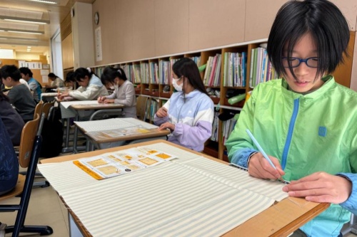 家庭科の授業でランチョンマットを作ります。今日の作業は,今後ミシンを使って縫い始める際に目印となる線を引きました。また,先生からミシンの使い方を教えていただきました。