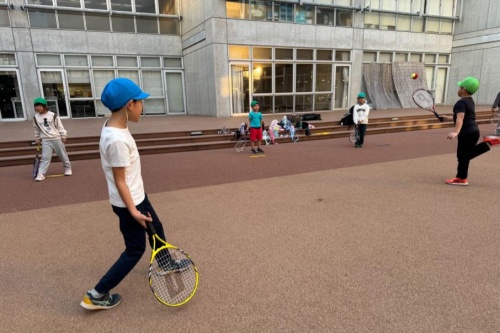 1~2年生のテニス入門の様子です。県内のテニススクールのESTから先生に来ていただきレッスンをしています。まずはボールとラケットに慣れることから始めます。また、基礎的な動きから平衡感覚や空間認知能力など、バランス感覚を身につけます。