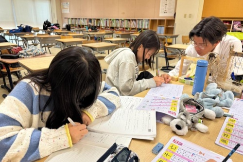 トワイライトスクールの始まる時間までの時間,学習会を行っています。担任の先生たちと,算数の問題や漢字の問題などに取り組んでいます。