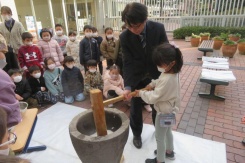 1月9日(木)は,Unit5の一環で日本の年中行事である「お正月」について学習し,日本の伝統に親しみました。班に分かれてすごろくやかるた,けん玉や福笑いなど,昔の遊びを楽しみました。餅つきではならわしや意味,由来などを理解しつつ,一人ひとりが石臼や杵を使って餅をつきました。つきたての餅を,しょうゆ海苔とあんこで味わいました。日本文化への理解や興味がより深まって欲しいと思います。