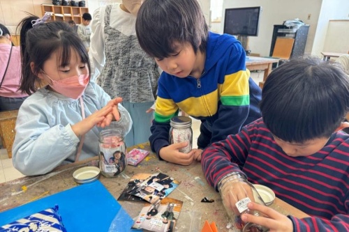 美術の時間にビンと紙粘土を使って,タイムカプセルを作りました。今日は未来の自分への手紙や,今の自分の宝物などをビンに入れました。この後はビンを石塑粘土で覆い,好きな形に造形して封をします。未来の自分を想像しながら作業することができました。