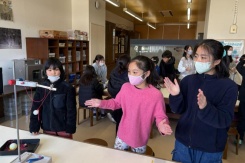 4年生の科学では,振り子の運動について学習しています。鉄球やスーパーボールなど5種類のおもりを用いて,おもりの種類や振り子の長さ,振れ幅を変えて,様々な音楽に合ったメトロノームを自作することを通して,振り子の規則性をとらえます。iPadを用いることにより各グループのメトロノームを瞬時に閲覧することが可能となり,子どもたちの学習がより豊かになっています。各グループの制作したメトロノームは多種多様で,それらを比較しながら,子どもたちは振り子の発案者ガリレオ・ガリレイのように仮説を立てました。
