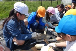 3年生は,PTの時間を使ってファームへ出かけ,じゃがいもを植えました。事前学習として,畝やマルチの役割も踏まえた植え方を学んでいた子どもたち。額に汗をにじませながら,土を掘り,種芋を丁寧に植えることができました。夏の収穫が待ち遠しいです。
