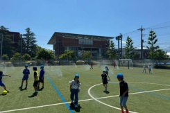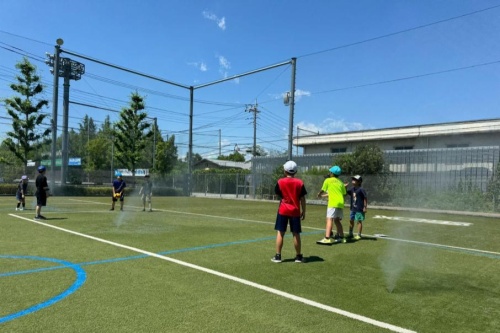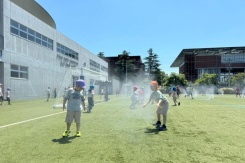 本校南側に位置する,運動場には,まるで天然芝のような最新技術の人工芝が敷き詰められています。また,熱中症対策として,小中学校では全国初となる「ミスト冷却装置」が設置されています。