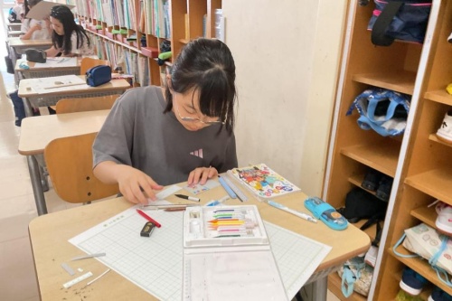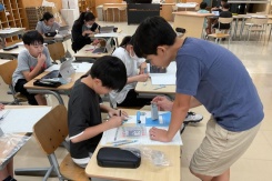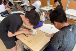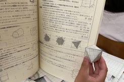 6年数の授業では,拡大図と縮図の学習をしています。「対応する辺の長さの比が変化しない」「拡大縮小しても角度は変化しない」の性質を活かして,身のまわりの箱や道具,立体的なものなどを拡大・縮小し,ミニチュアをつくっています。自分で再現したい箱や道具を持ってくる姿も見られました。