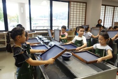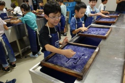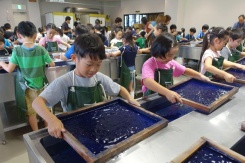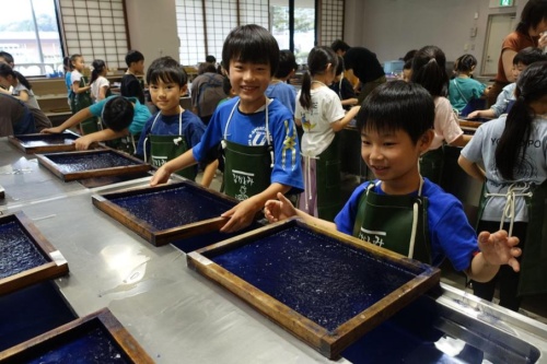 2学年の子どもたちはYAMANASHI PROJECTの一環で,にしじま和紙の里かみすきパークへ出かけ,字漉き体験と工房見学をしました。紺色と紫色,白のまざったすてきな和紙の作品ができあがりました。工房では,紙ができあがっていく様子に歓声があがりました。