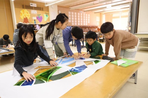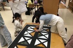 Glass museumチームは画用紙やカラーセロファンを使い,ステンドグラスを作るチームです。大作を作るには,集中力,忍耐力,そしてチームでの協力が欠かせません。グループごと団結して作品を作り上げるチームです。