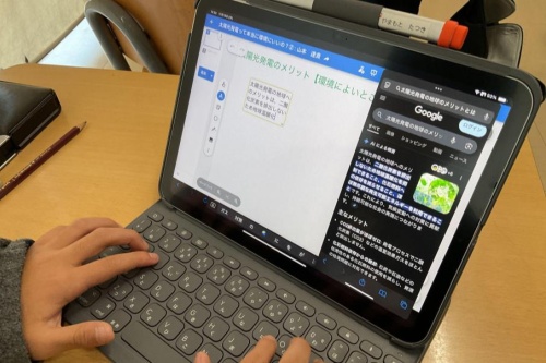 水,ごみ,エネルギーなど,順にトピックを立てながら広く“環境”について学んでいます。11月にはエネルギーについて調べる中で,夏に学んだ“山梨の水”との関連にも触れることになり,知識が深まってきました。再生可能エネルギーについては,メガソーラー問題への意見が分かれました。様々な視点でメリット・デメリットを調べながら,異なる考えに耳を傾け,議論する学習を行っています。
