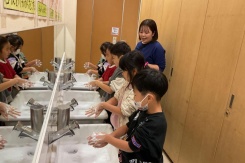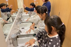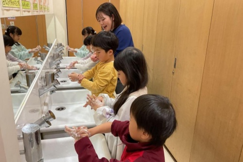その後「手洗いのうた」に合わせて,洗い方をレクチャーしてもらいました。「カメのポーズ」「おおかみのポーズ」「バイクのポーズ」など,みんなで歌いながら楽しんで手洗いをすることができました。