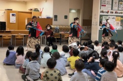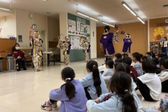 1年生では,日本文化をテーマに民謡踊りの出前講座を行いました。サマープロジェクトで盆踊りをしたことを振り返り,日本人の暮らしに関連していることを思い出しました。北海道のソーラン節では,手ぬぐいを用いて綱を引いている様子をあらわしたり,武田節では,刀を抜く場面を身振りで表したりと,踊りの振り付けにどのような意味が込められているかを学ぶことができました。