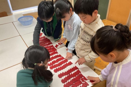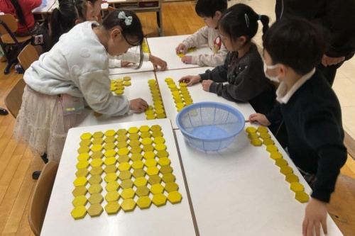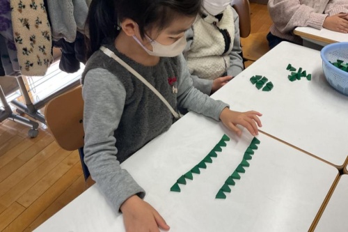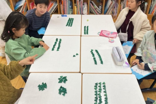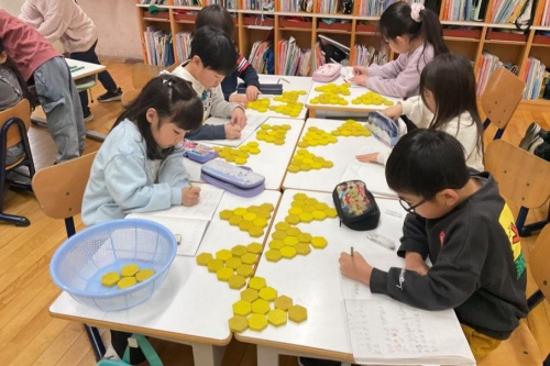 1年生の数の授業では100より大きな数を学習しました。たくさんあるブロックをわかりやすく数える方法を考え,10のまとまりをつくりながら友だちと協力して数を数えました。整理して数を数えるよさを感じながら,意欲的に学習に取り組んでいました。