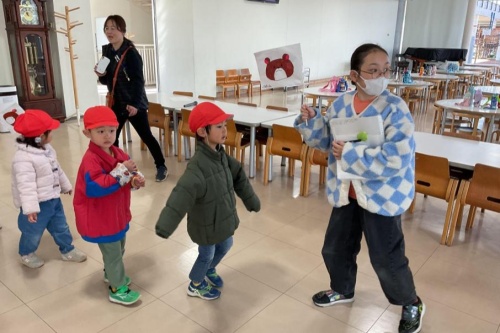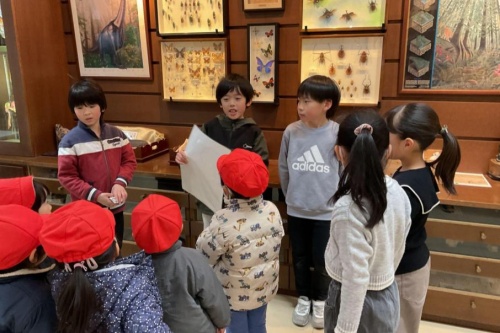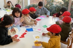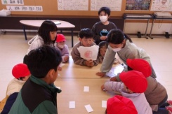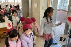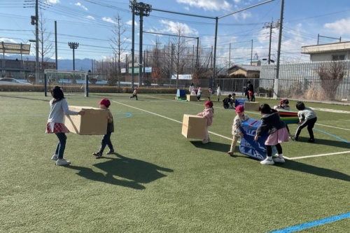 今週,山梨学院幼稚園の赤組さん(年少児)との交流会を行いました。子どもたちは数週間かけて準備を進め,赤組さんが楽しめるよう,「ちぎり絵」「宝探し」「もの運びリレー」「絵合わせ」の4つのブースを企画しました。当日は小さなお友だちに会えるのを心待ちにしながら準備を進め,赤組さんが来ると,堂々と手を引いて案内する姿が見られました。活動中は,目線を合わせて声をかけたり,「すごいね」と励ましたりと,優しく寄り添う関わりが印象的でした。待ち時間にはじゃんけんをするなど,赤組さんが飽きないよう工夫する姿も見られました。互いに笑顔で見送り合い,“誰かに楽しんでもらう喜び”を感じられた一日となりました。