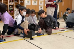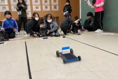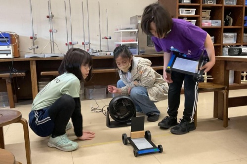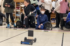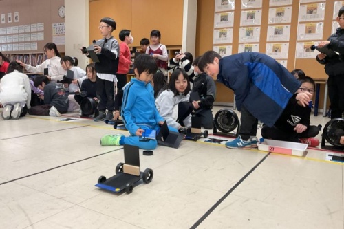 3年生の子どもたちは,「風とゴムのはたらき」について学習を進めています。1人1台の車を組み立て,風やゴムの力で実際に動かしながら確かめました。風の実験では,強さや向き,帆の大きさによって進み方が変わることに気づき,何度も試しながら理解を深めました。ゴムの実験では,引く長さと進む距離の関係を体感的にとらえていました。さらに,全員のデータをグラフにまとめることで,結果の違いや共通する傾向にも目を向けることができました。