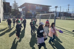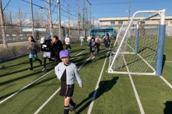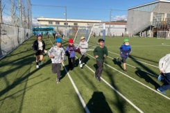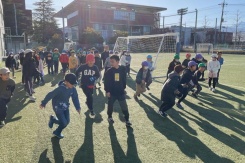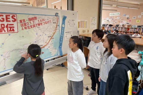 朝活動の時間にランニングをしています。4年生全員の走行距離を合計し,箱根駅伝の往復距離217.1km走破を目指す企画です。何人かが集まって何やら相談し始めると…数の学習を活用して,1人あたり運動場を何周走ればよいのか算出することができました。社会の学習が好きな子は,「今日は小田原まで行ったかぁ。釣りしたいなぁ」なんてつぶやいていました。あと数回の活動でゴールの東京まで襷をつなぐことができそうです。みんなで走ると楽しいです。