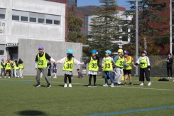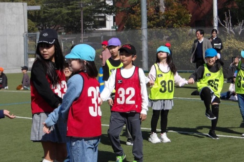 「手つなぎしっぽとり」では,班のメンバーで手をつなぎ,最後の子についたしっぽを取られないように協力しながら走り回りました。