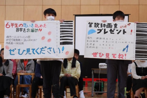 これまでたくさんお世話になった6年生へ向けて、6年生を送る会が行われました。1~5年生は、6年生に感謝の気持ちを伝えるため、精一杯準備をしていました。6年生もとても嬉しかったようです。6年生のみなさん、これからも応援しています。