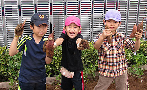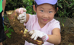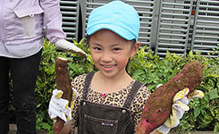 9月24日にサツマイモの芋ほりをしました。5月14日に苗を植えてから130日。サツマイモは大きく元気に育ちました。 DSタイムの2時間を使って、2年生みんなで収穫に汗を流しました。 まずは5メートルにも伸びたツルを根元から切りました。葉やツルをどけてみると、 なんと土の表面には、大きなおいもの姿が少しのぞいています。一つも土の中に残さないぞ!とばかりにa組もb組も夢中になって掘りました。収穫したおイモは約30㎏になりました。10月1日にはそのおイモを愛宕山で焼き芋にして食べるのを楽しみにしています。