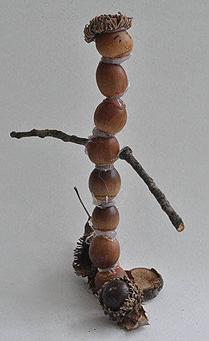 オクトーバープロジェクトの自然工作チームでは、秋の自然の中で木の実や小枝を集め、素材の色や形、手ざわりを感じながら作品づくりを行いました。異なる素材をつなげたり組み合わせたりして想像力を働かせることで、生き物や乗り物、食べ物に見えてきました。