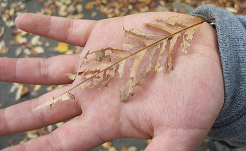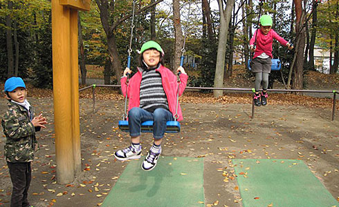 金川の森にいってきました。森の中の木々は、葉っぱが茶色や黄色に変わって冬支度がはじまっていました。 森を散策していると「あれ、葉っぱの下に虫がかくれているよ。」とある子がいいました。 みんなでのぞきこむと虫が寒さをしのぐために落ち葉の下にもぐりこんでいました。子どもたちは、それぞれ秋をさがしました。 小枝や紅葉を手に取って香りを楽しんでみたり大きなどんぐりをみつけたりしました。 黄色に色づいていた葉が、葉脈を残し食べ尽くされているのをみつけると「どんな虫が食べたのかな。」と考える子もいました。 自然の中で季節を感じることができました。