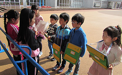 4月15日には、1年生と2年生の交流会が開かれました。この会では、2年生が1年生と一緒に学校の施設を巡り、ポイントの場所でクイズや劇にして学校紹介をしてくれました。1年生の子どもたちは、学校に関するクイズに答えてスタンプをもらったり、楽しい劇を見ながら友だちと仲良く笑ったりして、校内巡りに喜んで参加していました。