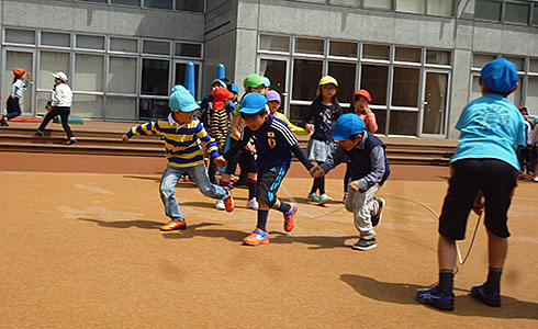 1年生を迎える会でプレゼントした一緒に遊ぶチケットとして、中休みの時間に長縄くぐりをしました。ペアになり、手をつないで「せーの!」と声をかけながらくぐっていきます。はじめは少し緊張していた1年生も、徐々に慣れていき、3年生に声をかけてもらいながら何度もくぐることができていました。とても楽しい時間を過ごすことができました。