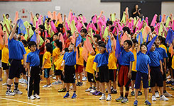 2015年スポーツフェスティバルが開催されました。今年のテーマは「Discovery(発見)」でした。歴史上の偉人たちが発見した様々なことについて学習を深めるとともに、自分たち自身も何かを発見しよう!という意気込みで取り組みました。オープニングでは、これまでになかった英語を取り入れたナレーションや天井に映し出したプロジェクション・マッピングなど、新たな挑戦をした活動を組み立て、会場の雰囲気を盛り上げました。教師のサプライズ競技もあり、日頃見られない縄跳びをする先生方の姿を見て、会場全体がより一層盛り上がりました。