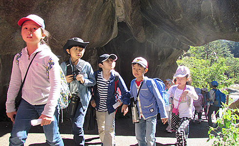 遠足日和となった10月7日に、2年生は昇仙峡に遠足に行ってきました。5km弱もの道のりを、友だちと励まし合いながら歩きました。疲れてきたり、つらくなってきたりしたときには、みんなで歌を歌ったり、習ったばかりのかけ算九九を唱えたりして、気分を盛り上げながら進みました。また、ほかのお客さんに元気の良い大きな声で「こんにちは」とあいさつをする姿が見られました。途中、天鼓林の休憩場所でおやつを食べたり、夢の松島でお弁当を食べたりしながら、秋のハイキングを存分に楽しみました。