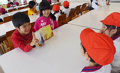この日のために何度も繰り返し練習を重ねてきた手遊びと読み聞かせでは、園児のみなさんの顔を見ながら笑顔で取り組みました。少し緊張していた赤組さんの表情もだんだんと笑顔になり、一緒に楽しむことができました。