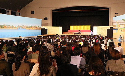 11月11日は、日本舞踊本公演がありました。子どもたちが古屋記念堂に入場すると、まるで江戸時代にタイムスリップしたかのような江戸の街並みが広がっていました。9月にワークショップで学んだ基本的な所作を復習しながら、本公演が始まりました。